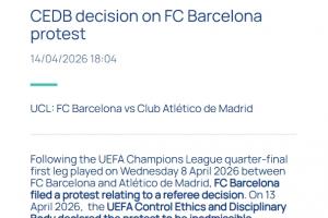 在2026年4月8日(星期三)进行的巴塞罗那对阵马德里竞技的欧冠四分之一决赛首回合比赛后,巴塞罗那足球俱乐部就裁判的某项判罚提出了抗议。2026年4月13日,欧足联道德与纪律审查机构宣布对该抗议不予受理。