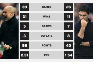 瓜迪奥拉vs阿尔特塔英超4月执教成绩:场均分2.51-1.54 胜场31-11