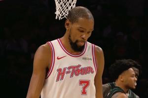 火箭进攻,杜兰特持球造成犯规站上罚球线但是第一罚罚丢。随后杜兰特第二罚故意罚丢,森林狼将球打出底线,最后1.1秒火箭获得前场底线球发球机会。